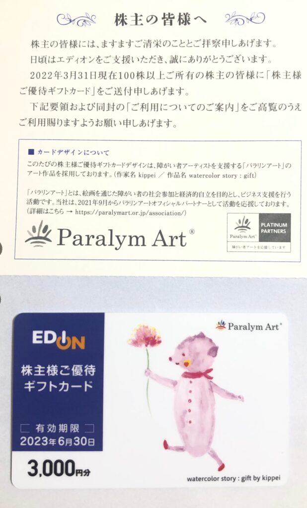 エディオンの2022年3月権利分の株主優待は2022年6月16日に到着しました。